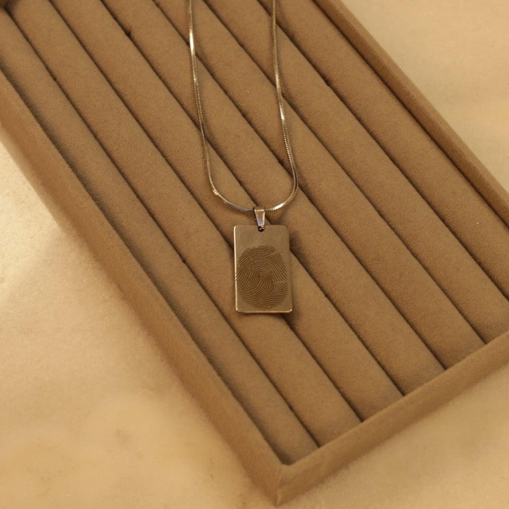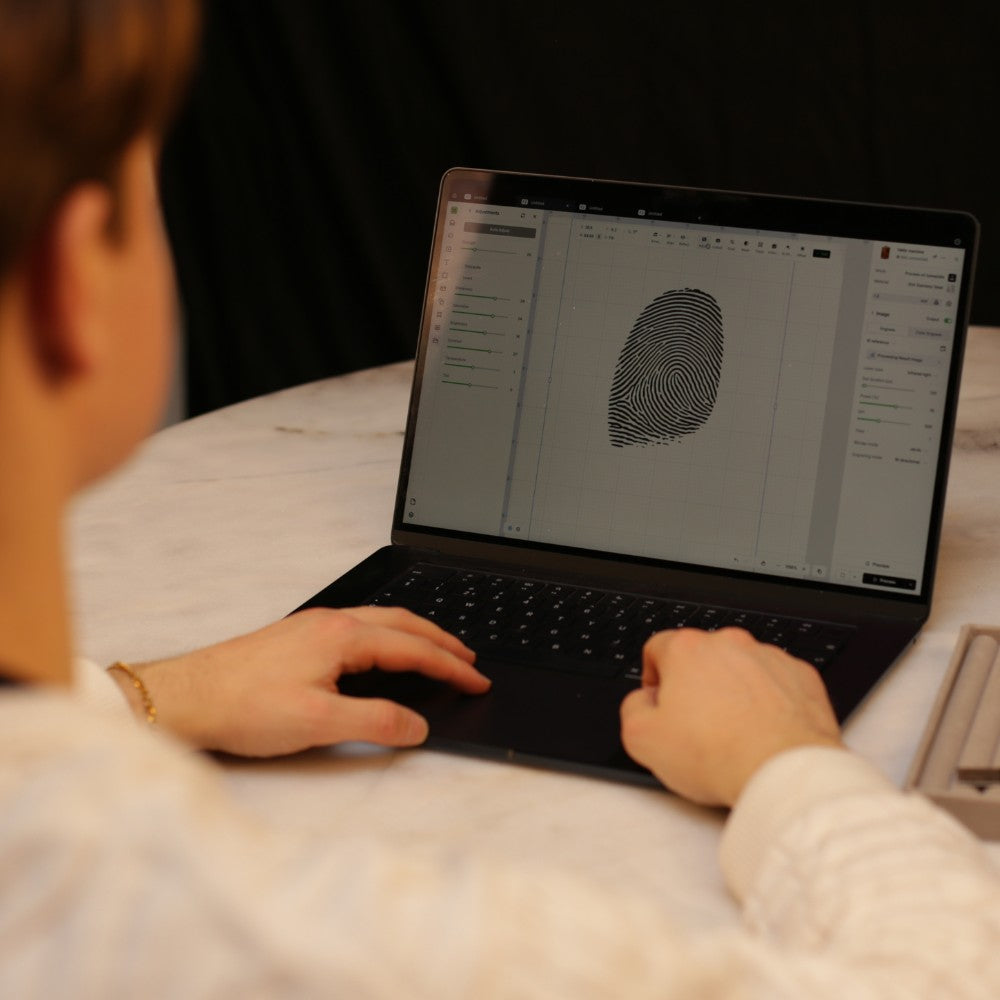 Met uiterst precieze lasertechnologie graveren we de vingerafdruk in het sieraad. Dit zorgt voor een blijvend ontwerp dat haarscherp blijft en niet vervaagt.