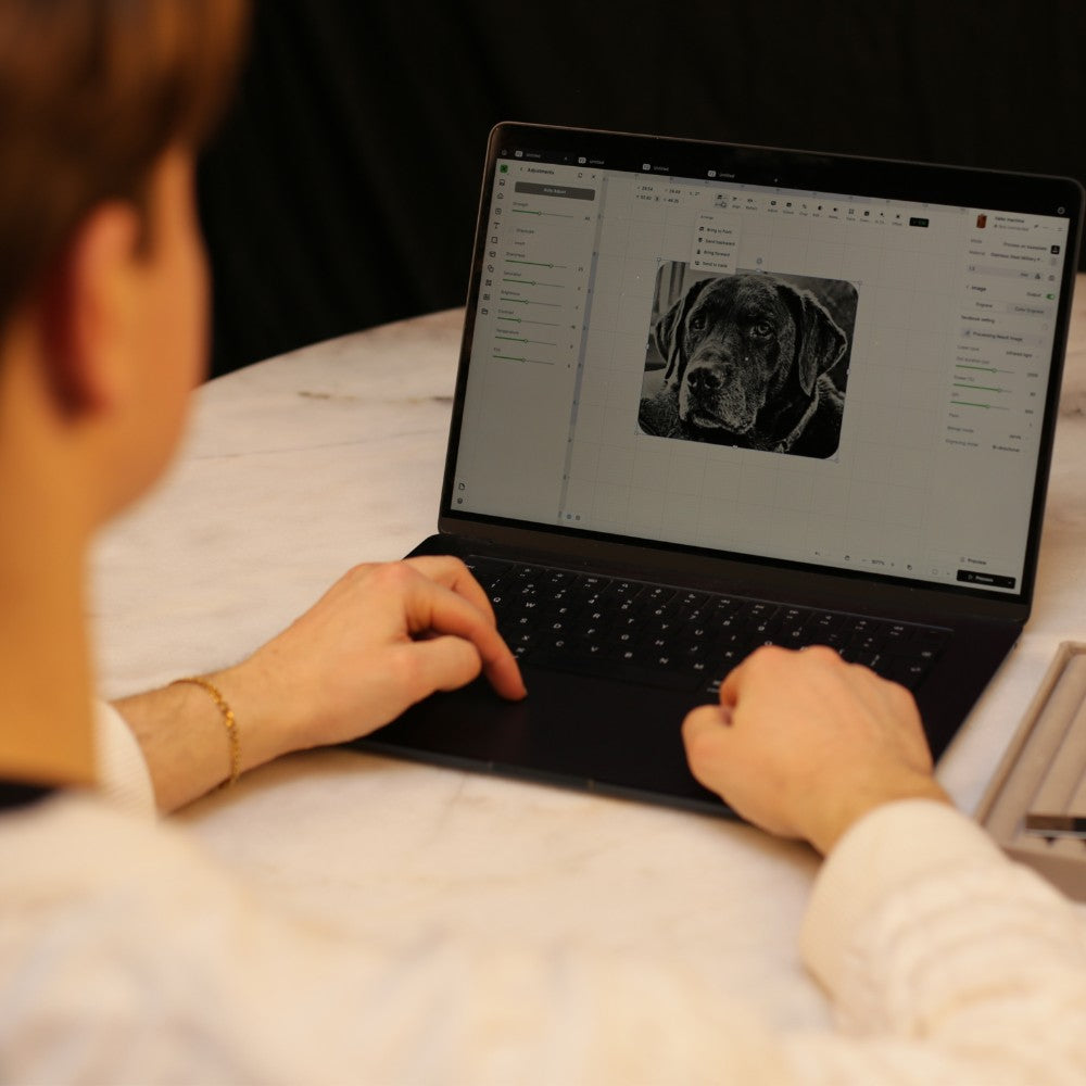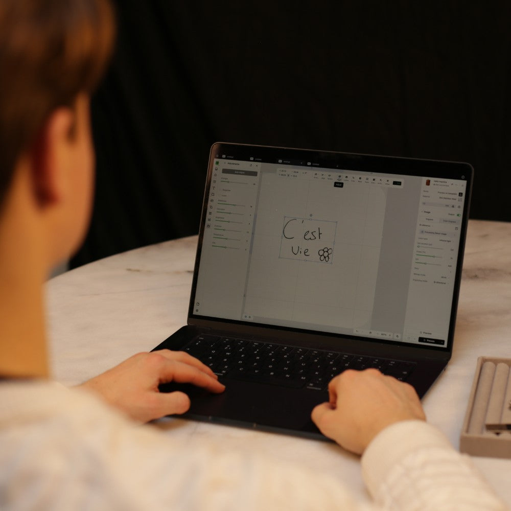 We schonen je foto digitaal op om ervoor te zorgen dat elke lijn helder en scherp is. We verwijderen eventuele vlekjes en maken van jouw zelfgemaakte afdruk een perfect ontwerp, klaar om te graveren.